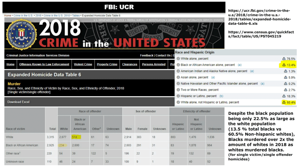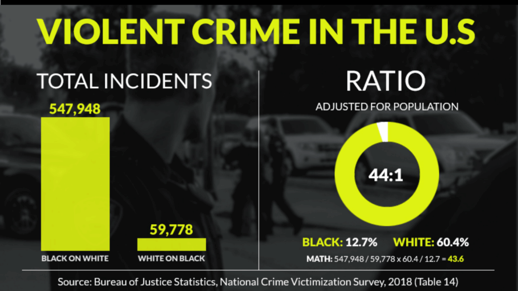 Here’s the part they absolutely will not put on television: almost all interracial violence in America flows in one direction. In 2018 there were roughly 547,000 black-on-white violent attacks and about 60,000 white-on-black! That’s not close to equal. That’s a 15-to-1 ratio in raw numbers, and when you adjust for population it’s closer to 70-to-1.