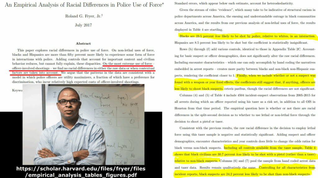 You were told that police are hunting black men. The actual data say the exact opposite. In absolute numbers, police shoot and kill almost twice as many whites as blacks every single year. Yes, per capita the rate is higher for blacks—but only because blacks commit violent crime at dramatically higher rates. When Harvard’s Roland Fryer—a black economist who went into the study expecting to prove bias—controlled for the crime rate, he found no racial bias in police shootings at all. In fact, in the raw data blacks were 23% less likely to be shot than whites in the same circumstances. Fryer’s 2017 NBER paper seals it: He says: “The results put me in cognitive dissonance.” No wonder—truth offends.