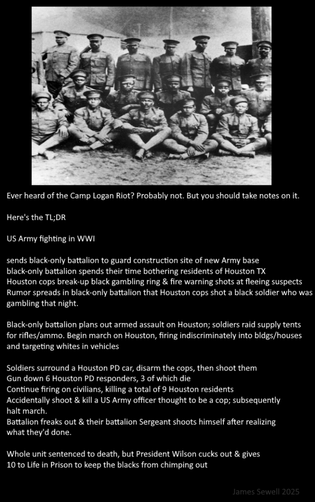 “Black privilege”: Riot without repercussion. Camp Logan 1917? Black soldiers killed 16 whites; narrative flips to “racist cops.” Tulsa 1921? White-on-black highlighted; black agency in riots omitted. This inversion not only shields perpetrators but gaslights ethnic Americans into doubting their own experiences of victimization.
