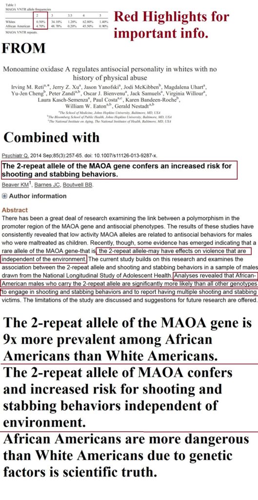 The Minnesota study is the reason the blank-slate crowd went silent or switched to screaming “racist” instead of debating the data. Because the data don’t care about feelings, and they point to the same conclusion as the MAO-A frequencies, the testosterone data, and fifty years of crime statistics: some of the black-white gaps we see are not going away with more programs or more guilt money. They are baked in at the population level, and pretending otherwise is getting people killed – mostly black people, but increasingly your people too.