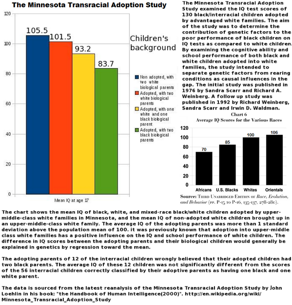- White adoptees (raised by white upper-middle-class parents): average IQ 106