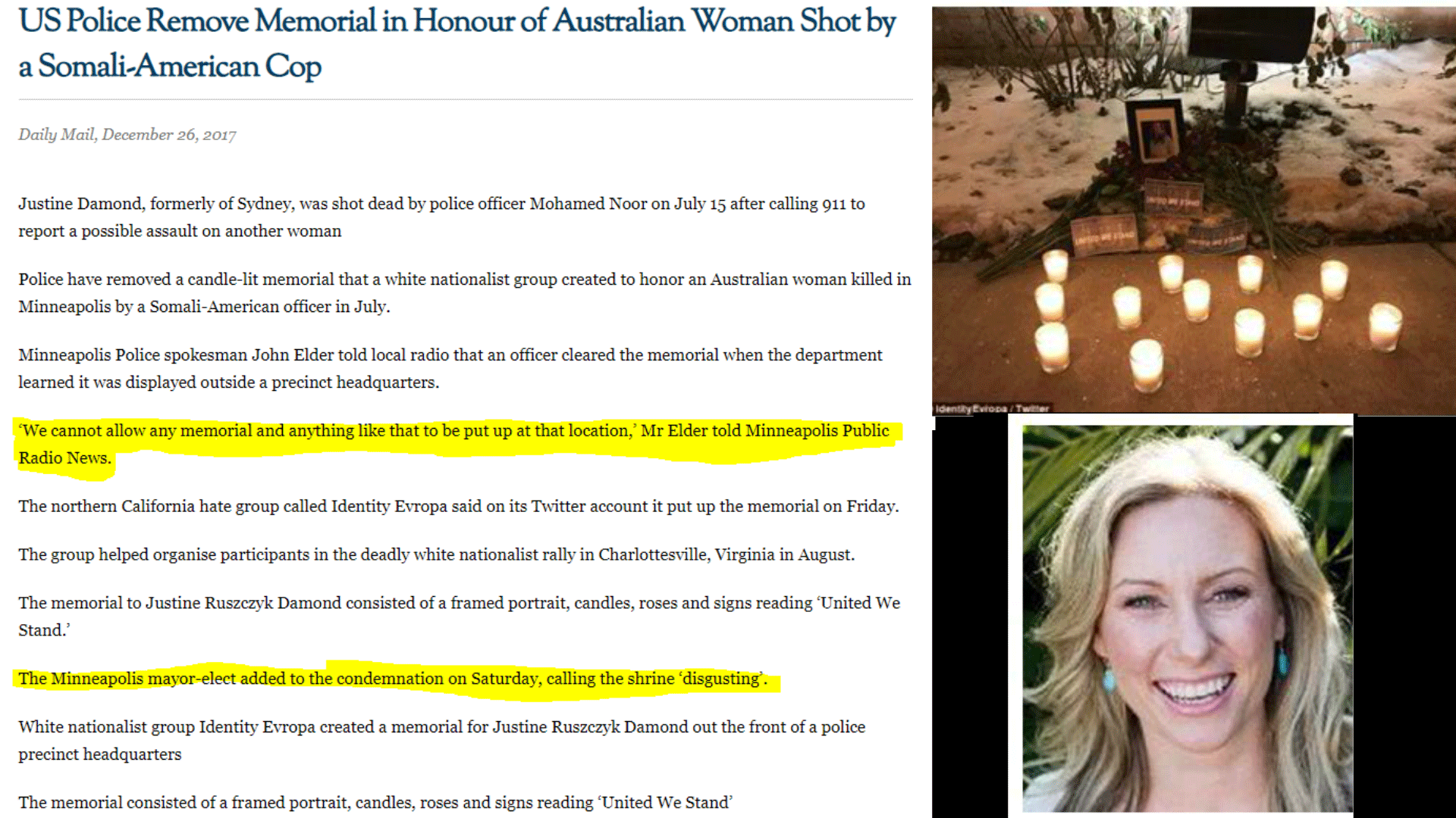 Justine Damond, white Aussie bride-to-be? Shot dead in 2017 by Somali cop Mohamed Noor after calling 911. Memorial? Dismantled as “hate speech.”