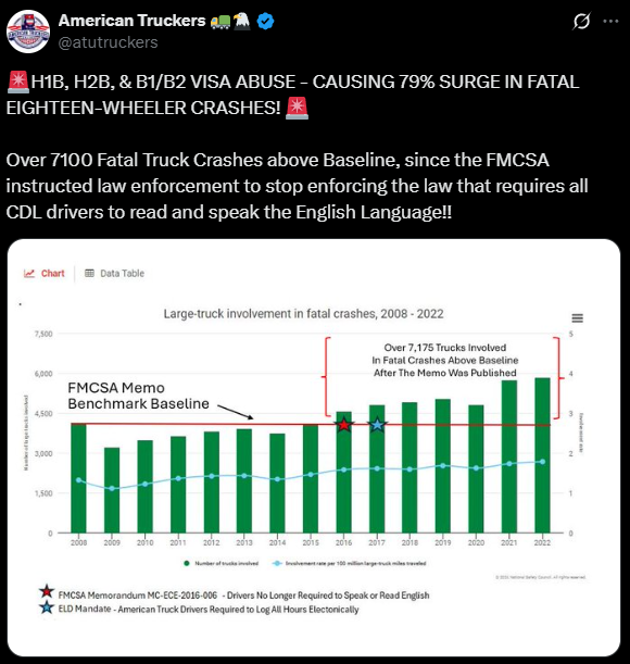 Trucking’s underbelly is deadlier: non-English CDL holders cause 20% more accidents, per FMCSA data, with grift like fake tests in New Mexico mills. X threads scream the truth: “200,000 THOUSAND Commercial Driver’s Licenses… 194,000 illegal,” with replies decrying “lives at risk.” One viral post: “They can’t even speak [English!]” alongside footage of a mangled semi.