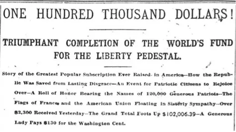 France paid for the statue itself. America was supposed to pay for the pedestal but almost didn’t because the project ran out of money until Joseph Pulitzer, an immigrant, ran a fundraising campaign in his New York World newspaper and shamed rich Protestants into coughing up the cash.