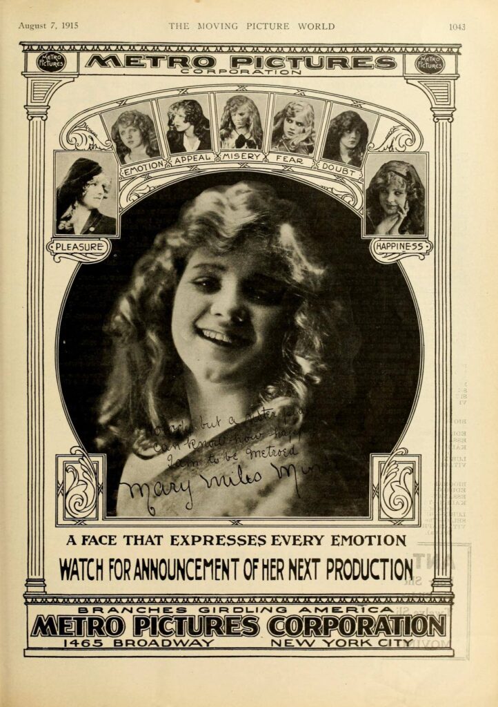 Her breakthrough came with Anne of Green Gables (1919), directed by William Desmond Taylor, where her portrayal of the plucky orphan resonated with Ethnic American families, grossing over $500,000—a fortune equivalent to $9 million today. Critics hailed her as “America’s Darling,” positioning her as a direct rival to the established order and Mary Pickford. Yet Minter’s appeal was deeper: she represented authenticity in an industry increasingly commodified. In 1919, at just age 17, she signed a groundbreaking $1 million contract with RealArt Pictures, making her tied for the third-highest-paid actor in Hollywood behind Charlie Chaplin and Mary Pickford and equal to Roscoe “Fatty Arbuckle”. Adjusted for inflation, that’s over $18 million, underscoring her value as a box-office draw. Her films like Jenny Be Good (1920, watch clips here) and The Little Clown (1921, watch clips here) showcased her range, blending comedy with heartfelt drama that celebrated rural virtues and moral clarity. While full prints are rare, surviving fragments and related silent films are available on YouTube.