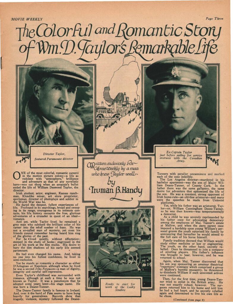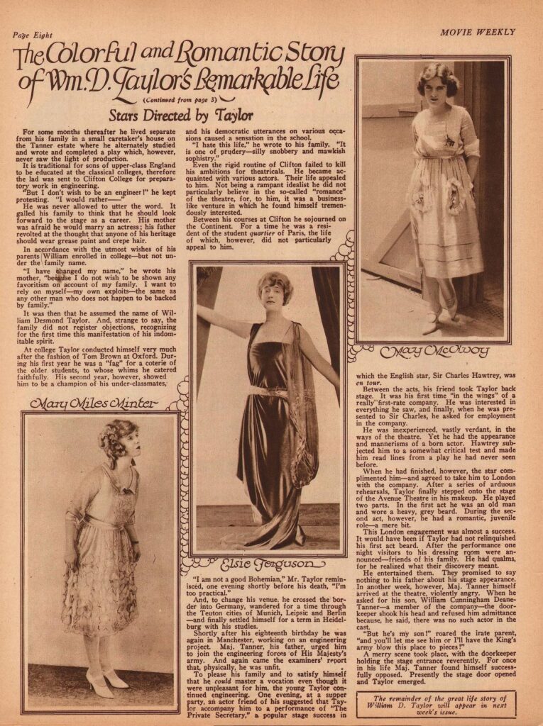 On the evening of February 1, 1922, in his elegant bungalow at 404-B South Alvarado Street in Los Angeles’ upscale Westlake district, William Desmond Taylor welcomed his dear friend Mabel Normand for a quiet chat. Taylor, born William Cunningham Deane-Tanner in 1872 to a prominent Anglo-Irish family, had ascended in Hollywood as a respected director at Paramount, helming over 50 films (filmography here) featuring stars like Mary Pickford and Wallace Reid. His work emphasized moral tales and Ethnic American resilience, as in Anne of Green Gables, where he discovered Minter’s star power.